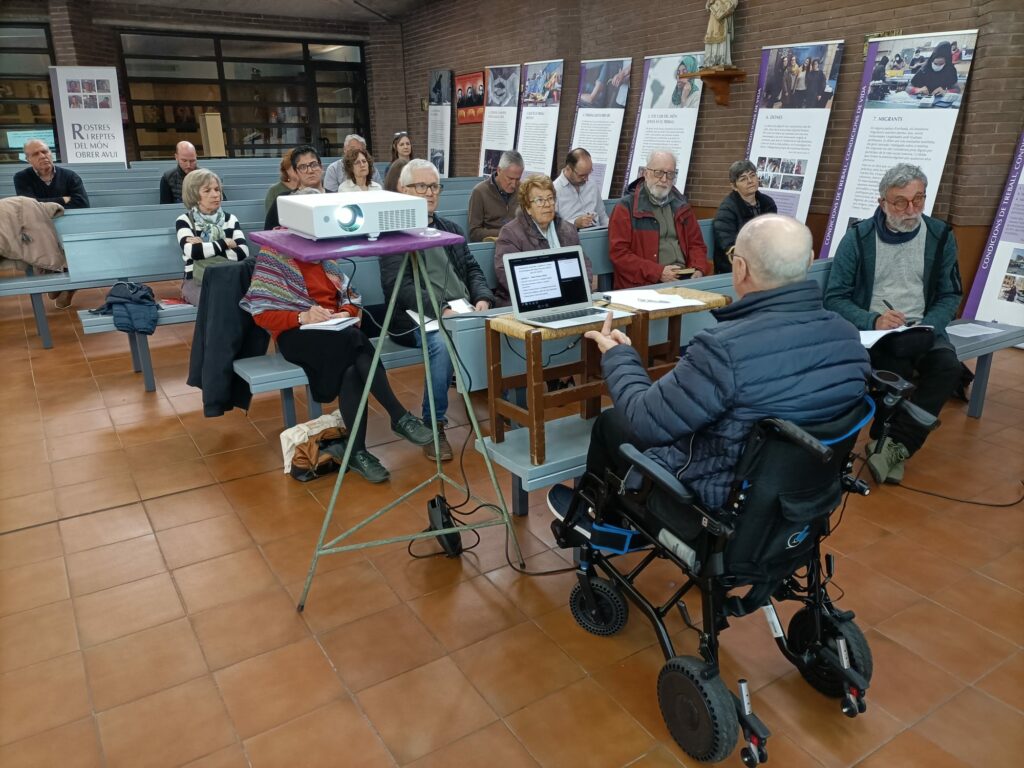 Este año la Jornada de Formación diocesana se hizo en la iglesia de la Balconada de Manresa. El 7 de marzo la mayoría de militantes de los tres grupos diocesanos, así como alguna persona no vinculada al movimiento, asistimos a una Jornada impregnada de esperanza. Para empezar nuestro consiliario general, el Pratso, hizo la plegaria bajo el hilo del optimismo, con dos textos de Francesc Torralba y de Charles Péguy. La ponencia fue a cargo del geógrafo, miembro de Cáritas y exsindicalista metalúrgico manresano, Rufí Cerdán, bajo el título “Militancia cristiana frente a la descomposición eco-social y política”. A partir de unas preguntas relacionadas con los derechos laborales, la distribución de la riqueza, la vivienda, el medio ambiente o los derechos sociales, profundizamos con un largo debate de las problemáticas actuales, del cambio en los derechos desde la II Guerra Mundial hasta el día de hoy, la desigualdad laboral, social y habitacional que está presente en la sociedad. La hora de los cafés, coca y galletas llegó y las fuerzas las cargamos para la segunda parte de la Jornada, en la cual el ponente nos hizo reflexionar con dos encíclicas, la Laudato si’, que aborda más la crisis ecológica, del papa Francisco y la Dilexi te, que aborda más la pobreza, del papa León XIV. La complementariedad de las dos encíclicas nos hace entender un mundo postcapitalista que la concentración del capital, la destrucción de puestos de trabajo, ecosistemas y de escudos sociales está muy presente, pero con la verdad que el lugar de privilegio para vivir el evangelio es el de los pobres. Se destacó que todavía hay escenarios de resistencia comunitaria, como la de parte de la población de Minneapolis frente a la policía de fronteras del ICE y tantos otros. El camino a seguir es el de la transición ecosocial, batallas sociales para seguir luchando como la del feminismo, estar junto a los marginados y que se tiene que trabajar con instituciones locales para conseguir transformaciones sociales. Fe ante el futuro que impregnó toda la Jornada, que tiene que ser activa y por último una reflexión sobre el Apocalipsis, que no es el final, sino la purificación necesaria para una nueva creación. Después de la ponencia de Rufí Cerdán y de un coloquio nos despedimos, no sin entregarle al ponente como gratitud, el último libro de Torralba “Anatomía de la esperanza”, esperanza que rodeó toda la Jornada de Formación de la diócesis de Vic.
