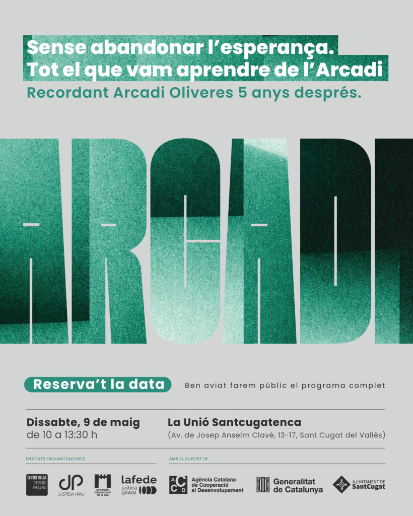 Este pasado 6 de abril, Lunes de Pascua, hacía cinco años del traspaso de ARCADI OLIVERES. Con el lema “Sin abandonar la esperanza; recordando a Arcadi Oliveres”, la UNIPAU, el Centro Delàs, Lafede.cat y Justicia y Paz han coorganizado un acto que quiere ser, a la vez, un recordatorio del legado de Arcadi en clave de lucha por la justicia global, pero también, quieren hacer espacio a activistas y luchas actuales que él mismo habría impulsado y defendido.