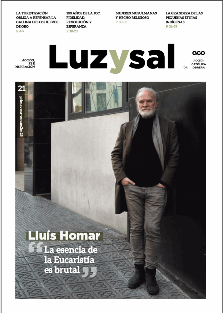 EDITORIAL PRUEBA DE FE NOS SUMERGIMOS LA TURISTIZACIÓN OBLIGA A REPENSAR LA GALLINA DE LOS HUEVOS DE ORO A PIE DE CALLE PENSAR LA ACTUALIDAD CON SIMONE WEIL (1909-1943) INSPIRACIÓN LLUÍS HOMAR, ACTOR EN PEREGRINACIÓN AL SER DOSSIER 100 AÑOS DE LA JOC VIDAS QUE SON LEVADURA REMEI RAMÍREZ, SUJETO DE LAS BIENAVENTURANZAS DE JESUCRISTO EL EVANGELIO ES VIDA PENTECOSTÉS: DESCUBRAMOS LA LUZ QUE NUNCA HA DEJADO DE BRILLAR COMPARTIENDO ACO LUZYSAL, UNA PRAXIS DE LA ESPERANZA SOMOS DIVERSAS MUJERES MUSULMANAS Y HECHO RELIGIOSO LA IGLESIA SE MOJA LOS VASOS COMUNICANTES DE JUSTÍCIA I PAU Y ACO CONEXIONES LA GRANDEZA DE LAS PEQUEÑAS ETNIAS INDÍGENAS ALTERECONOMÍA LA SOBERANÍA ALIMENTARIA